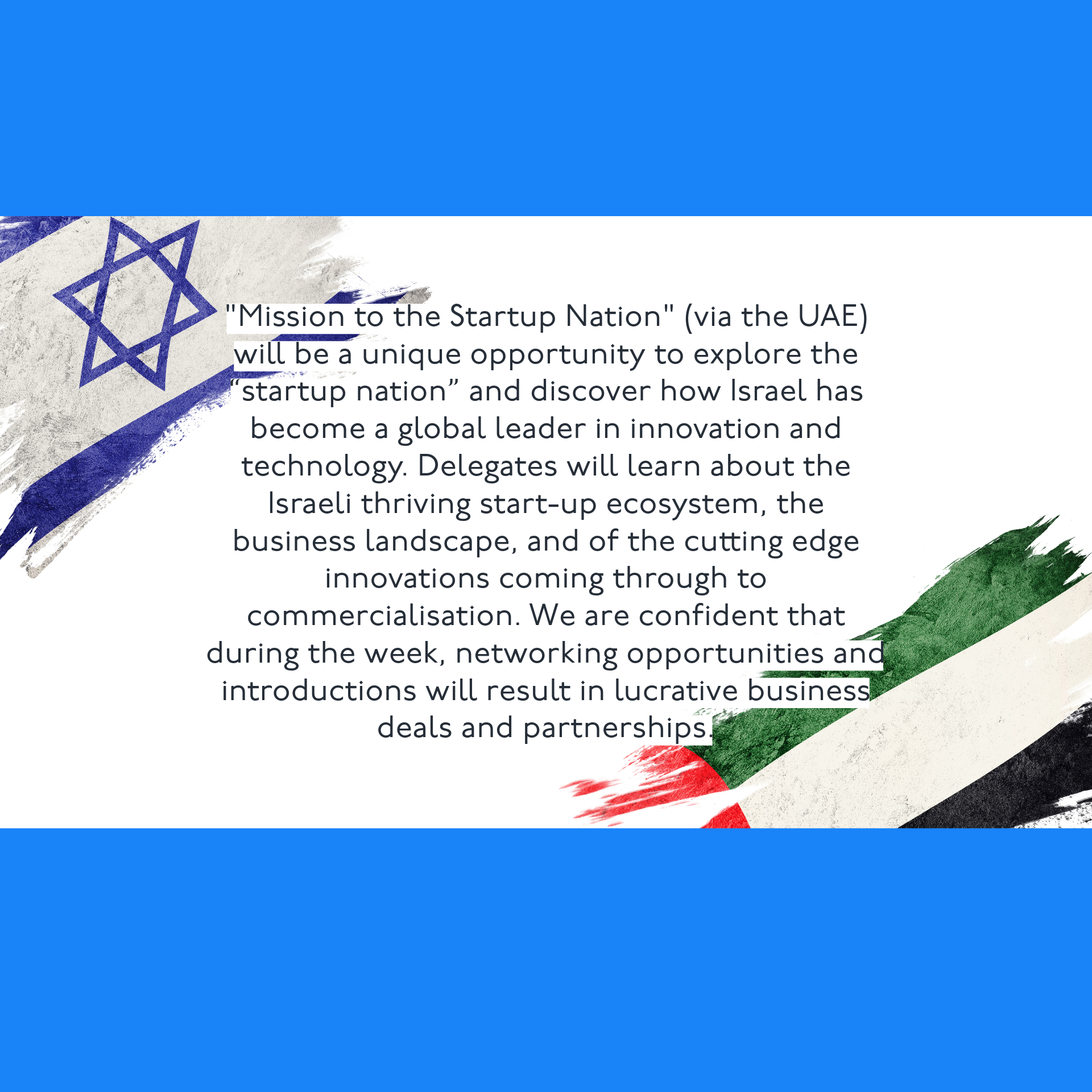 19th to the 25th of November, 2023Israel and the UAEExplore Israel, the "startup nation," and witness their thriving tech ecosystems and innovations. Join our delegation for a unique opportunity to explore their business landscape and economic story.